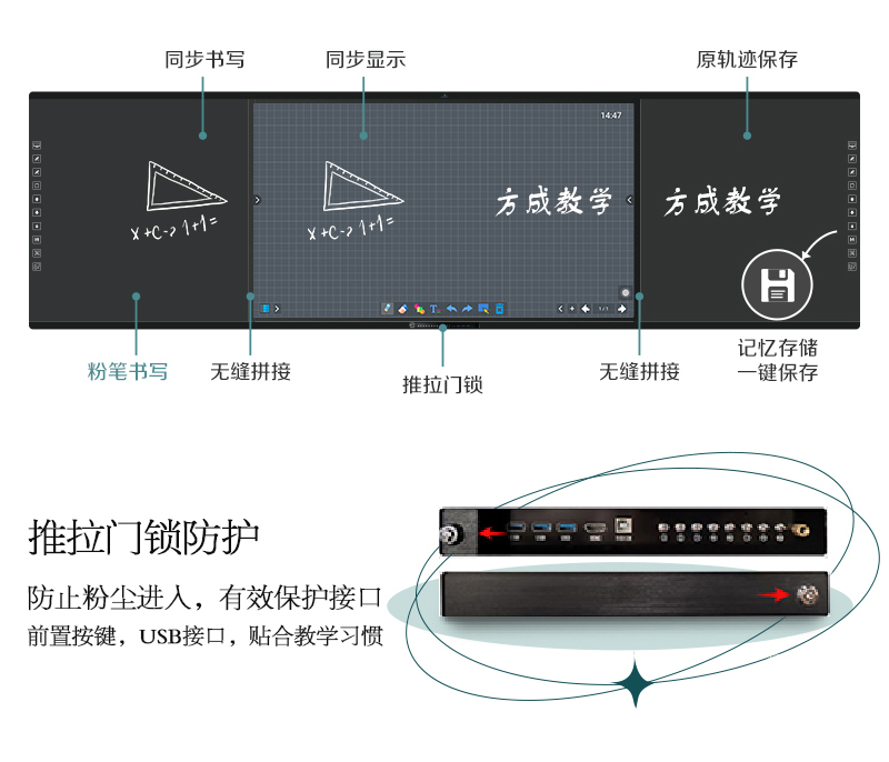 機身保護——獨特的推拉門鎖設(shè)計,保護前置按鍵及接口,還能收納白板筆和教鞭;